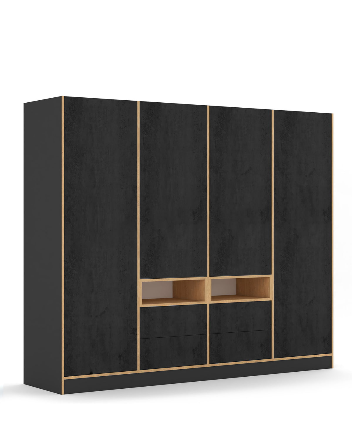 Mahukas nelja uksega riidekapp, mille keskosas on neli sahtlit ja kaks kast-riiulit.