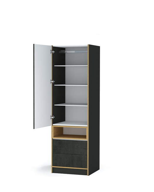 Ühe push to open uksega riidekapp, millel on kast-riiul ja sahtlid. Kogu mööbel on disainitud ja toodetud Poolas.