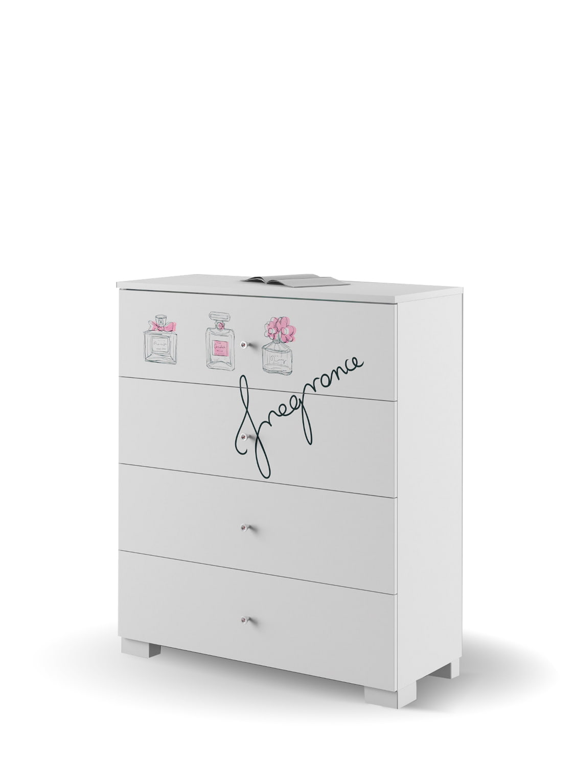 Graveeritud sahtlid moeteemaliste motiividega. Stiilsed kristalsed käepidemed. Korpus valgest lamineeritud plaadist.