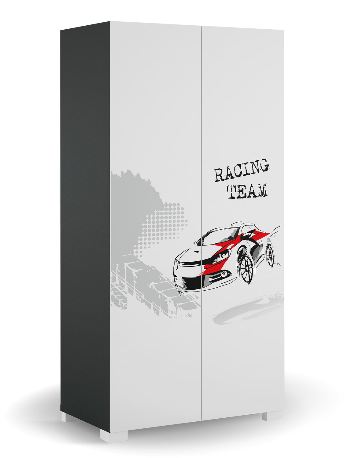 Graveeritud ja värvitud uksed võidusõiduautode motiividega. Korpus antratsiidivärvi lamineeritud plaadist. Vajutamisel avanevad uksed.